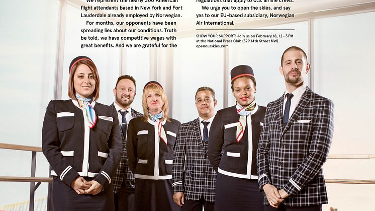 « Hemos venido a la capital de la Nación a para decirle, de una vez por todas a nuestro Gobierno, que es hora de aprobar la solicitud Norwegian Air International, la cual está en plena conformidad con el Acuerdo de Cielos Abiertos. Represento a los 300 TCPs de nuestras bases de Nueva York y Fort Lauderdale y queremos que nuestras nuevas rutas ofrezcan más empleos para pilotos, tripulaciones y las comunidades locles, al tiempo que proporciona más opciones y precios más bajos para el viajero estadounidense », declaró Joseph Gabriel, jefe de tripulantes de cabina en la base de Norwegian en Fort Lauderdale.