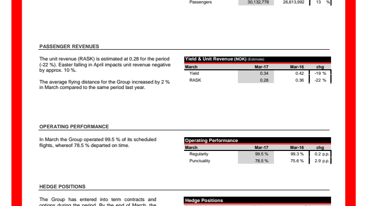 Un total de 2.453.551 pasajeros optó por Norwegian en marzo, 258.514 más que en el mismo mes del año anterior. En términos unitarios, la capacidad ofertada (o AKO, asiento-kilómetro ofertados, véase glosario al pie de esta nota), creció un 16%, mientras que el tráfico de pasajeros (o PKT, pasajero-kilómetro transportados), lo hizo un 22%. La ocupación media fue del 84,1%, ó 3,8 puntos porcentuales por debajo del mismo mes del año anterior. Ello se debe a que la Semana Santa de este año cae en abril (mientras que el año pasado cayó en marzo), reduciendo así los ingresos en un 10% aproximadamente.