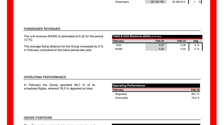 Norwegian transportó 1.871.396 pasajeros en febrero, un incremento del 15% comparado con el mismo mes del año anterior. En términos unitarios, el tráfico de pasajeros (o PKTs, pasajero-kilómetro transportados, véase glosario al pie de esta nota) se incrementó en un 20%, mientras que la capacidad ofertada (o AKOs, asiento-kilómetro ofertados) lo hizo en un 19%.