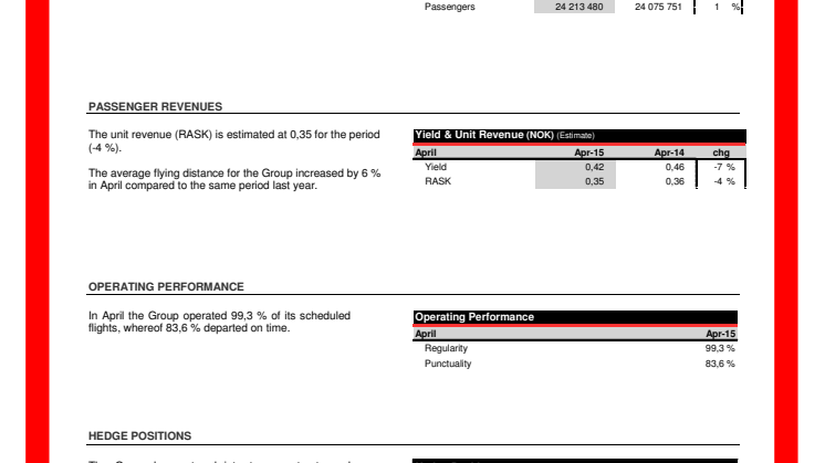 Un total de 2.134.040 pasajeros volaron con Norwegian en abril de 2015, un incremento del 7% comparado con el mismo mes del año anterior. El coeficiente de ocupación fue del 82,4%, lo que representa un incremento de 2,6 puntos porcentuales. En términos unitarios, el tráfico de pasajeros (o PKTs, pasajero-kilómetro transportados, véase glosario al pie de esta nota) se incrementó en un 14%, mientras que la capacidad ofertada (o AKOs, asiento-kilómetro ofertados) lo hizo en un 11%.