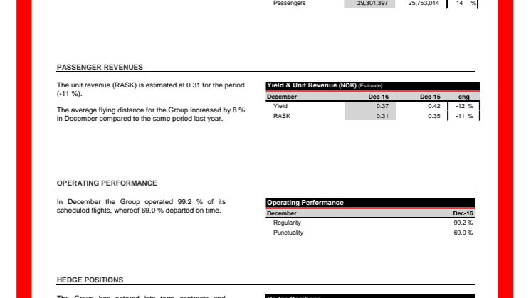 Norwegian obtuvo en 2016 sus mejores cifras de tráfico anuales, con casi 30 millones de pasajeros y una ocupación del 88%. El lanzamiento de 34 nueves rutas y un incremento substancial en el tráfico intercontinental contribuyeron considerablemente al crecimiento.