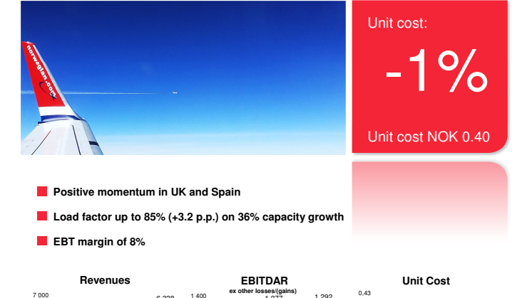 El beneficio antes de impuestos (EBT) fue de 505 millones de coronas noruegas (60,27 millones de euros; 1 corona noruega = 0,1193 euros), comparado con los 604 millones de coronas del mismo trimestre del año anterior. La combinación de una débil corona noruega, el retraso en la aprobación por parte del Departamento de Transporte de los Estados Unidos del permiso a Norwegian Air International, y costes asociados con retrasos en vuelos, han afectado los resultados de este trimestre. El uso del wet-leasing para substituir aviones y costes extras de fuel, así como el alojamiento y manutención de pasajeros afectados por retrasos también han conllevado costes.