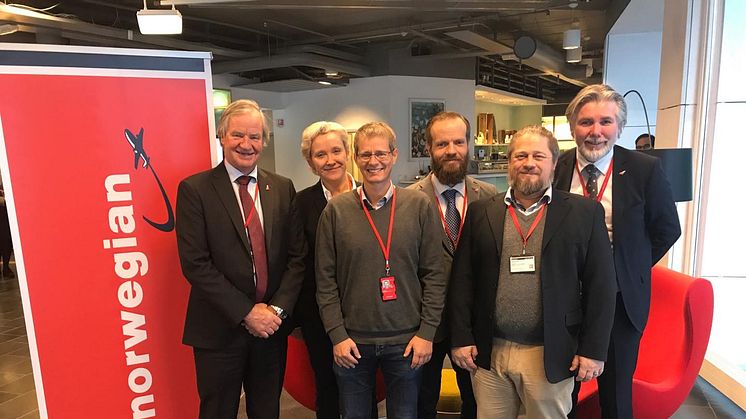 (En la imagen, Bjørn Kjos, fundador y consejero delegado de Norwegian; Helga Bollmann Leknes, directora general de Recursos Humanos del Grupo Norwegian; Uffe Jesper Faerch Jensen, Martin Stork y Adam Mark Smith, delegados del SEPLA en Norwegian; y Bjørn Erik Barman-Jenssen, consejero delegado de Norwegian Air Resources).