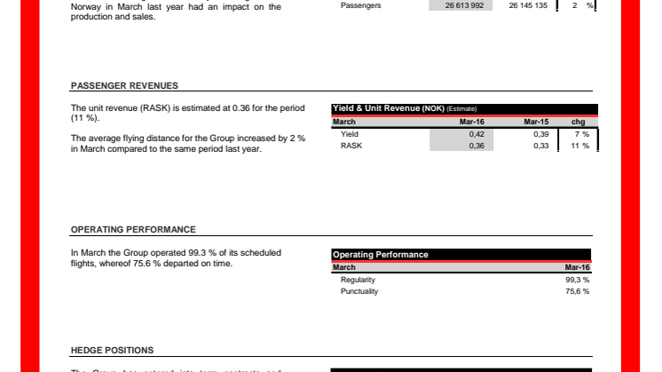 Los datos de tráfico de marzo se caracterizaron por un mayor volumen de pasajeros y de nivel de ocupación. Sin embargo, hay que tener en cuenta que la huelga de pilotos escandinavos de marzo de 2015 afectó al tráfico. Además, este año (a diferencia del anterior) la Semana Santa ha caído por entero en el mes de marzo.